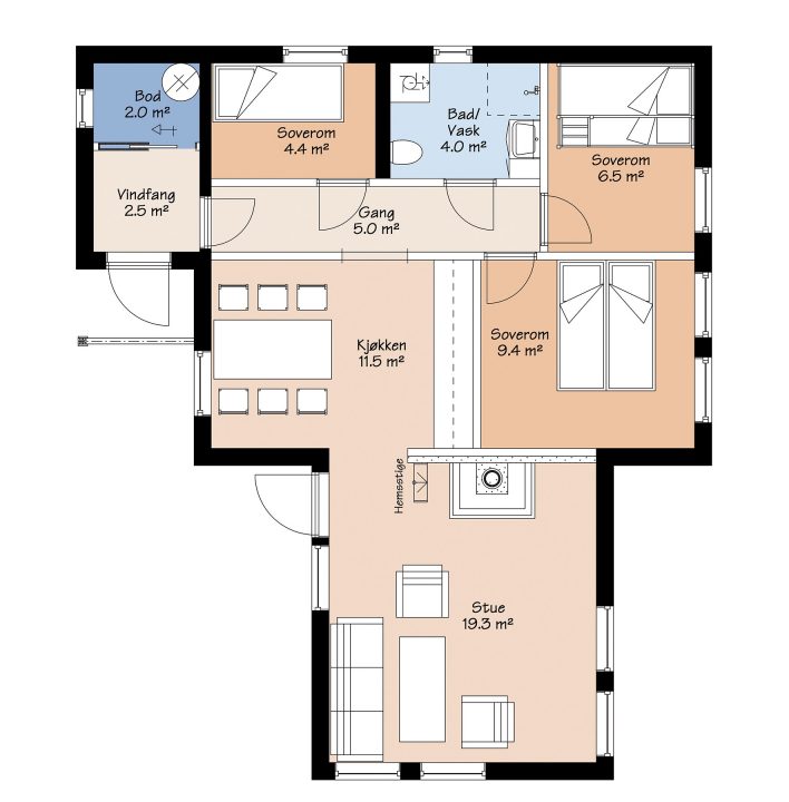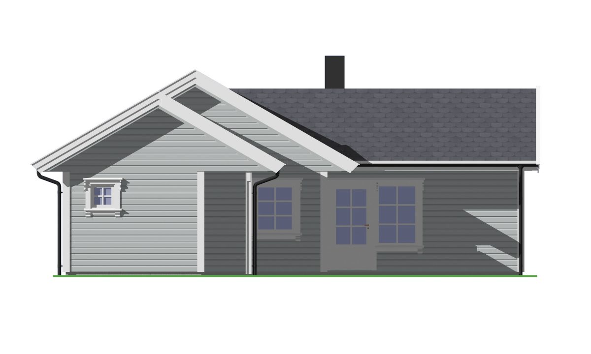 Liten, praktisk hytte med god planløsning. Passer godt både ved sjøen og på fjellet. Hytten har 3 soverom og en hems over stuen. Ideell hytte til småbarnsfamilier.