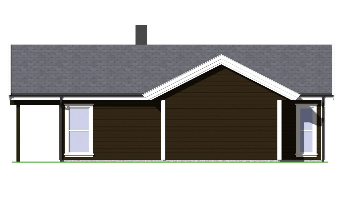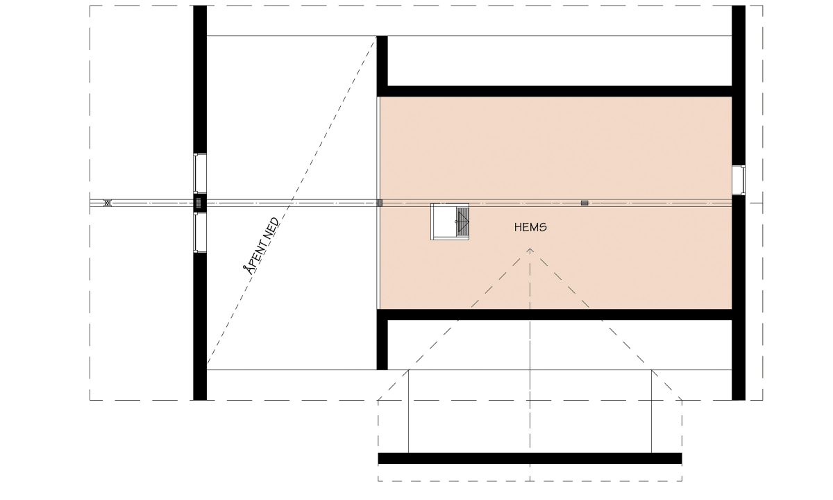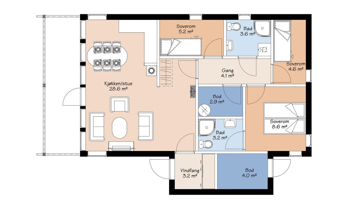 Kompakt hytte der hovedsoverom har eget bad. Store vindusflater på kjøkken og stue gir mye lys. Uteplassen er overbygget med utgang fra stue. Stor hems gir mange ekstra soveplasser.
