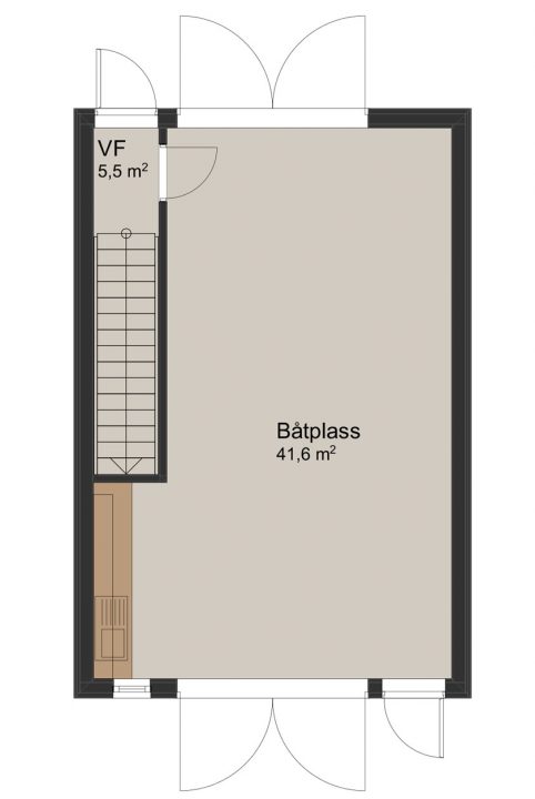 I første etasje finner du et stort rom som er ment for oppbevaring av båt. Brede porter i begge ender av bygget gjør at det er enkelt å få båten ut og inn av rorbuen, og langveggene egner seg godt til oppbevaring av fiskeutstyr og vedlikeholdsprodukter til båten. Du finner også et grovkjøkken for sløying av fisk i denne etasjen, samt adskilt trappeoppgang til oppholds- og soverom i andre etasje.