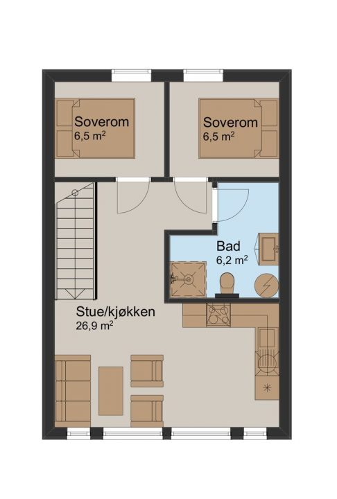 Går du opp trappen kommer du inn i en trivelig stue-/kjøkkenløsning med plass til både sittegruppe og spisebord. Taket er mønt, så det er høyt under taket og lyset fra vinduene gjør dette til et godt opplyst rom hvor man kan nyte utsikten til sjøen utenfor. Fra allrommet har du også tilgang til hyttens to soverom og et romslig bad.