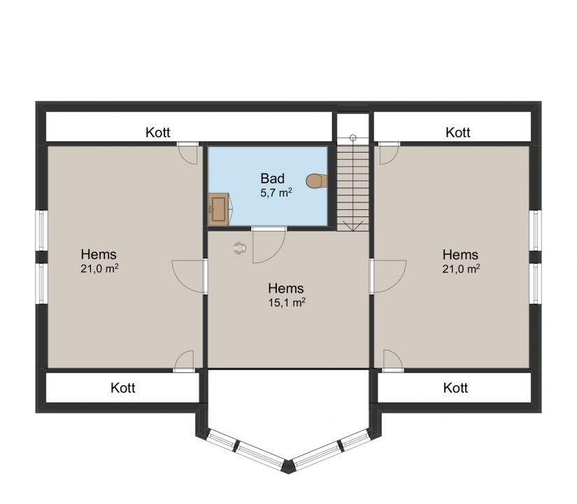 Går du opp trappen fra vindfanget kommer du til en lys og åpen hems som egner seg flott til loftstue. Her kan de som ønsker sitte litt for seg selv. God takhøyde og store vinduer gjør dette rommet til et nydelig sted å speide ut over naturen utenfor. De to andre rommene i andre etasje egner seg godt til soveplasser eller for lagring. Har du behov for enda mere lagringsplass, kan du ta i bruk kottene.
