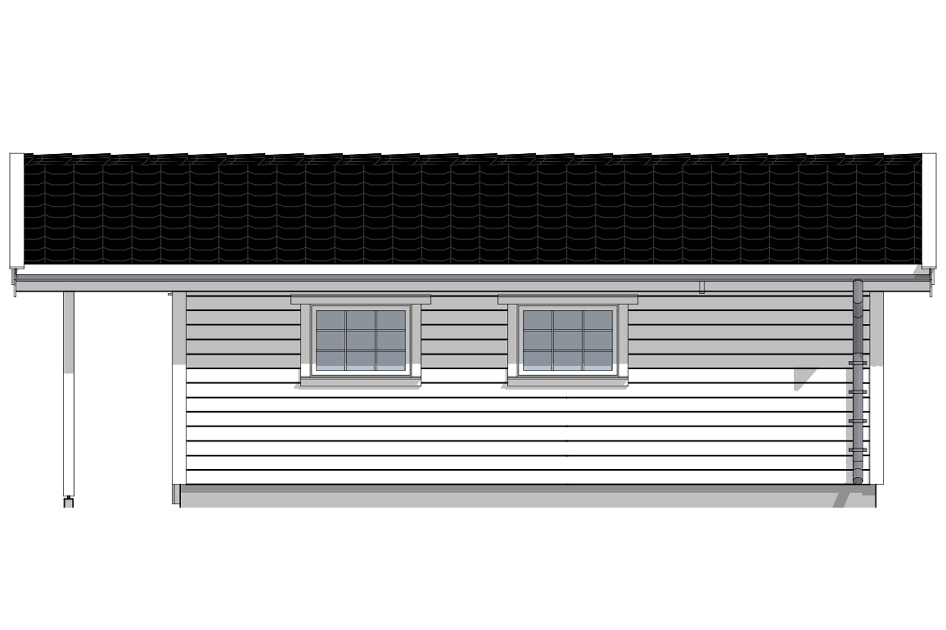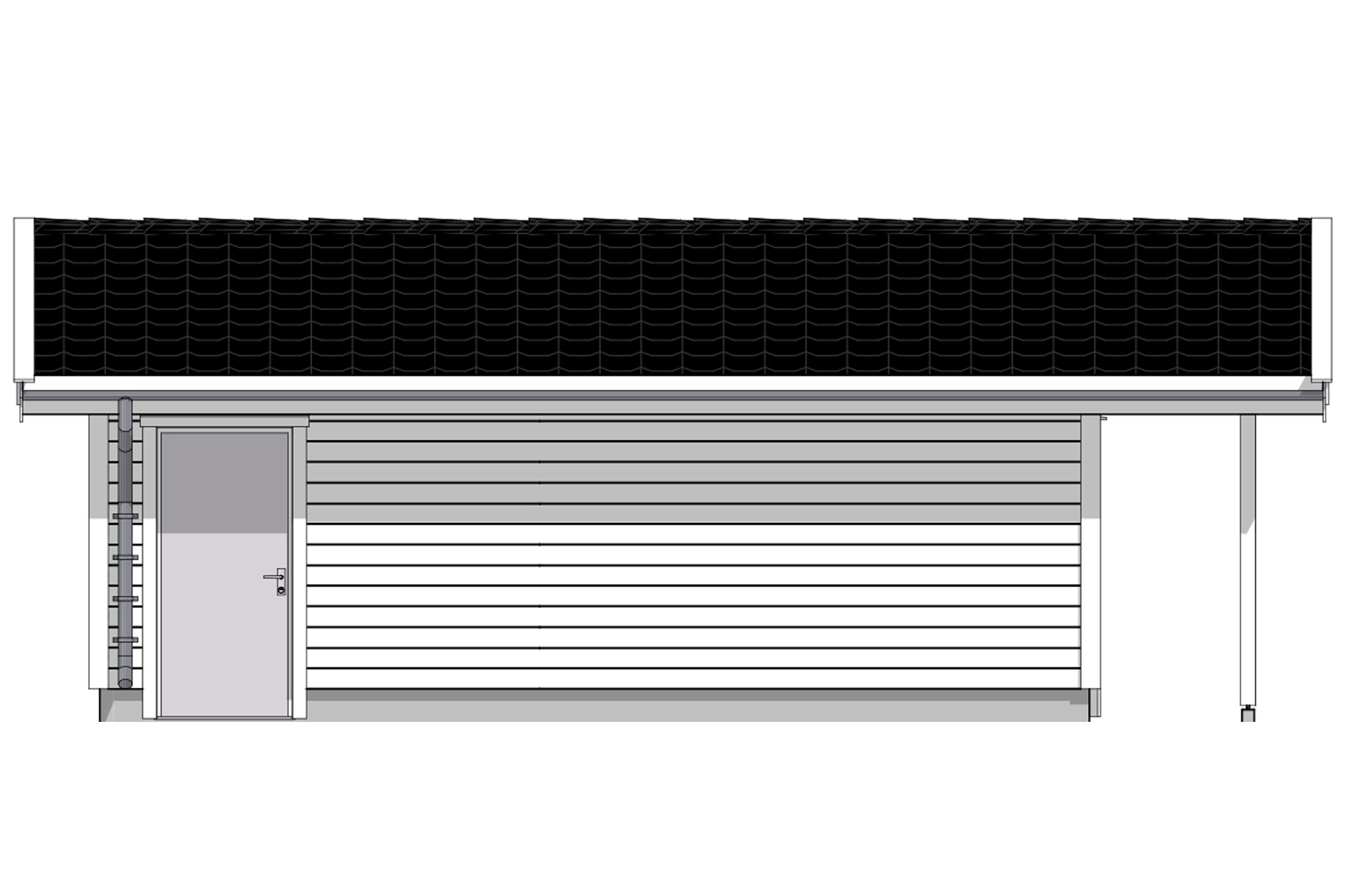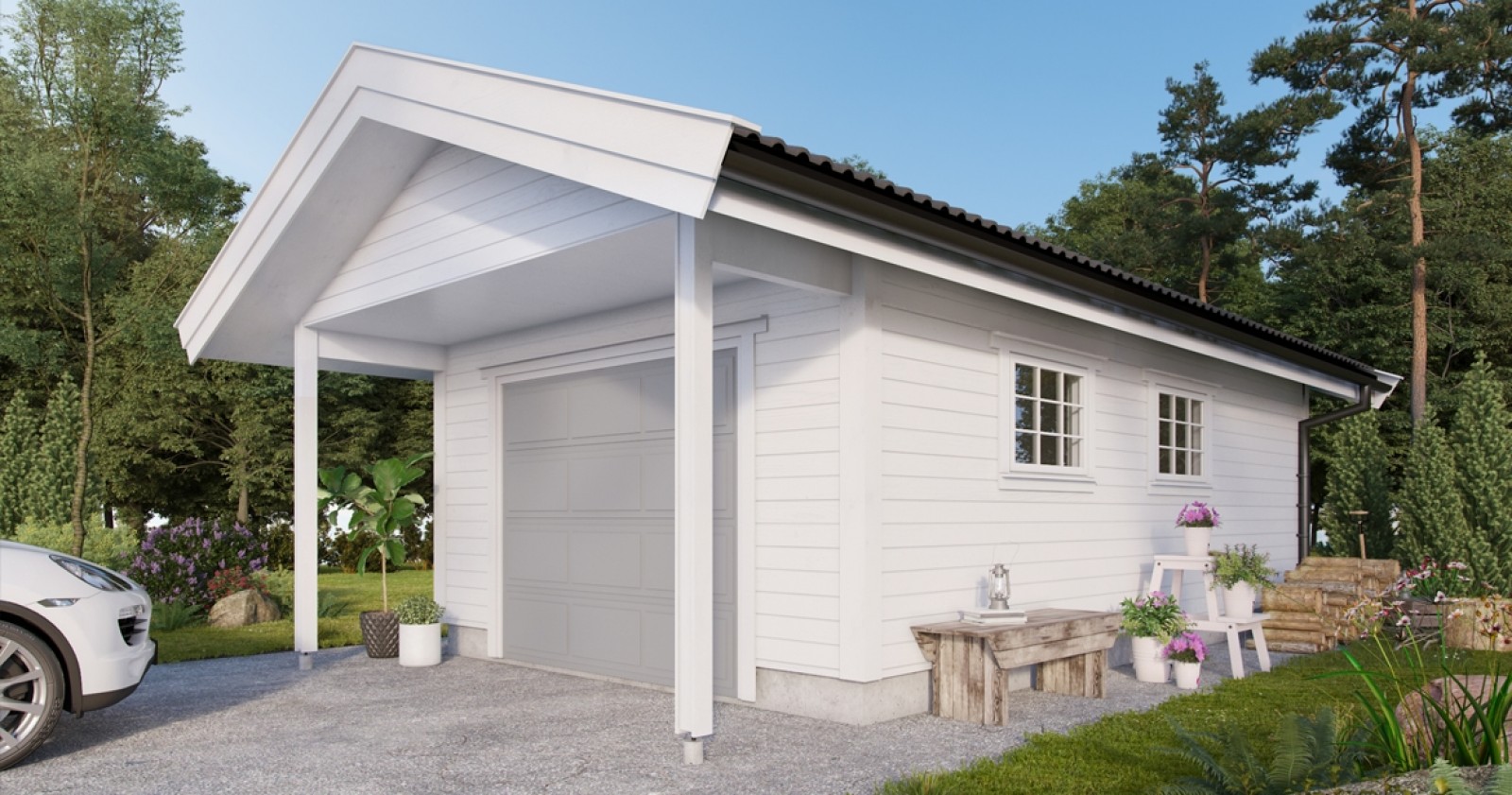 Den klassiske garasjen 802 har mønt tak og en enkel fasade som vil passe inn de fleste steder. Overbygg og søyler gir garasjen et klassisk ytre.