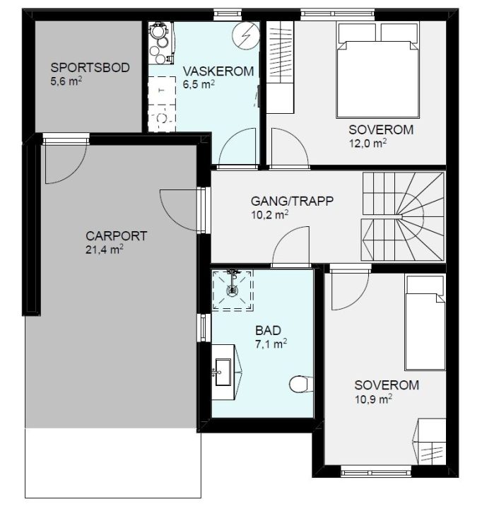 I Uno er arealet utnyttet til det ytterste. Overbygd carport med inngang direkte til både bolig og sportsbod.