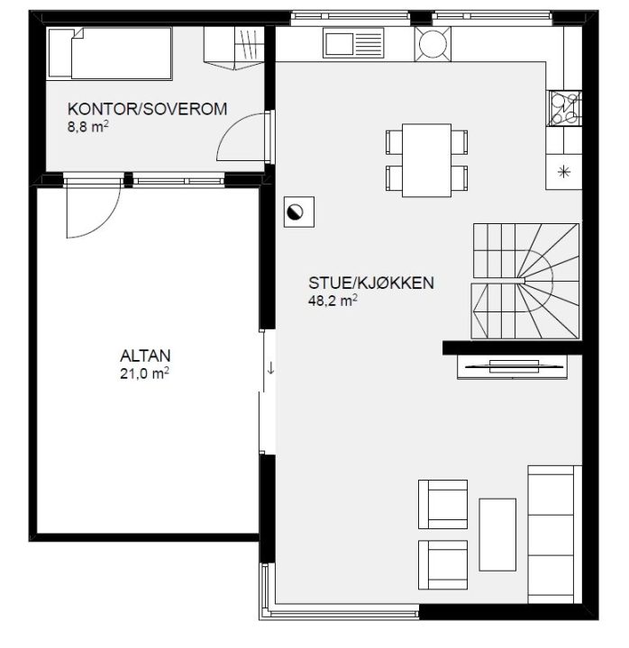 I boligens første etasje finner du to store soverom, et bad og et vaskerom. I andre etasje finner du et kontor, som også kan benyttes som et tredje soverom. Fra den romslige åpne stue- og kjøkkenløsningen kan du ta deg ut på en herlig altan, med plass til hele familien.