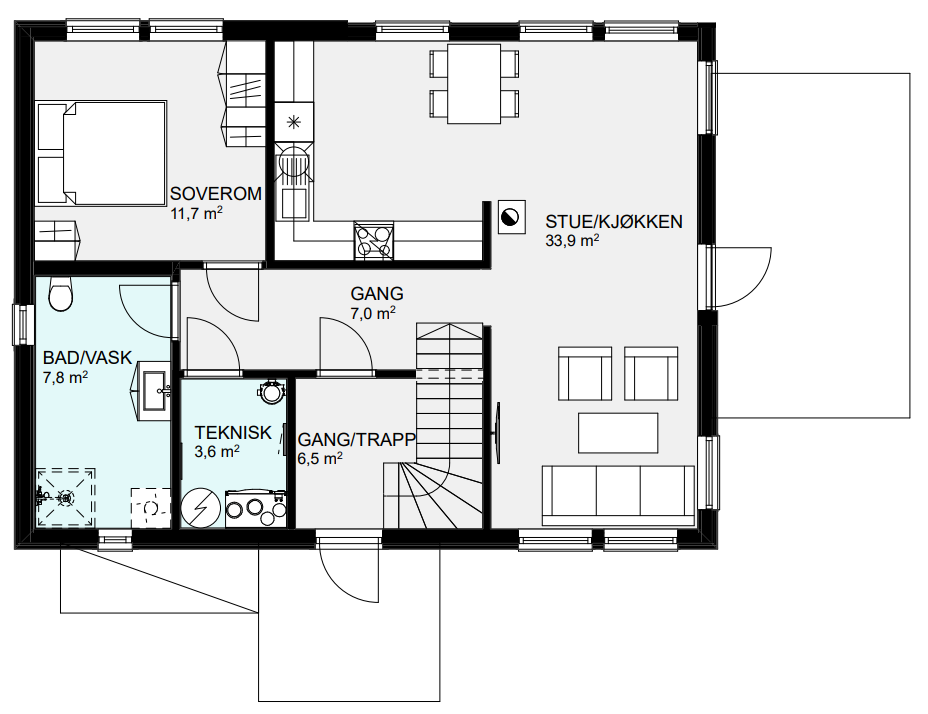 Fra boligens overbygde inngangsparti, kan du ta deg videre til en gang som tar deg opp til andre etasje eller videre inn i husets første etasje. I boligens første etasje har du alt du trenger av nødvendige funksjoner. Her finner du et stort soverom, et romslig bad, et teknisk rom og en åpen stue- og kjøkkenløsning på hele 34m2.