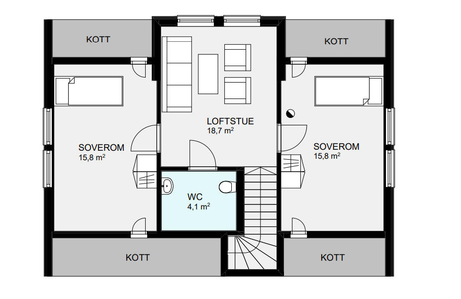 I boligens andre etasje finner du to soverrom med gode oppbevaringsmuligheter, et bad og en hyggelig loftsstue som barna kan boltre seg på.