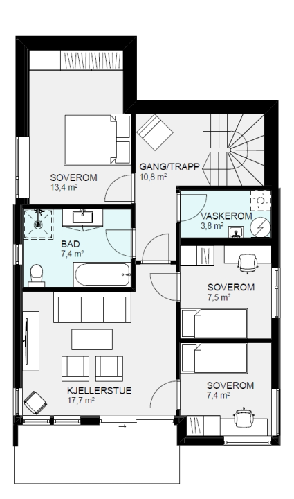 I boligens første etasje finner du tre store soverom, et bad, et vaskerom og en herlig kjellerstue som barna kan benytte. Fra kjellerstuen kan du ta deg videre ut til boligens uteområder.
