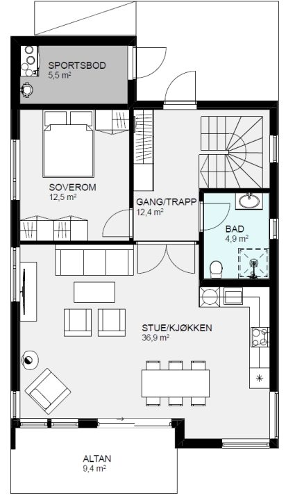 Gjennom et overbygd inngangsparti har du tilgang til sportsbod med gode oppbevaringsmuligheter, samt inngang til husets andre etasje. Gjennom gangen kan du ta deg videre til soverom, bad og trappen ned til første etasje. I tillegg finner du en åpen stue- og kjøkkenløsning med direkte tilgang til en koselig altan.