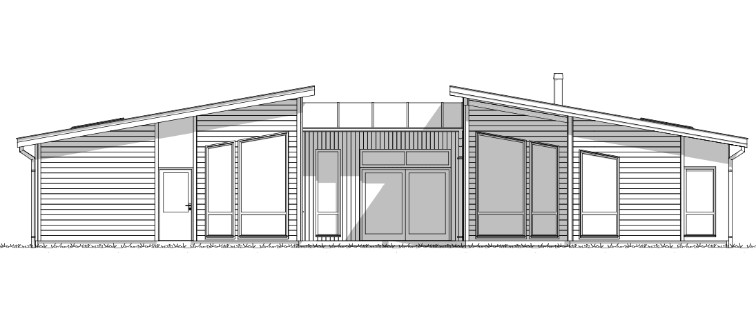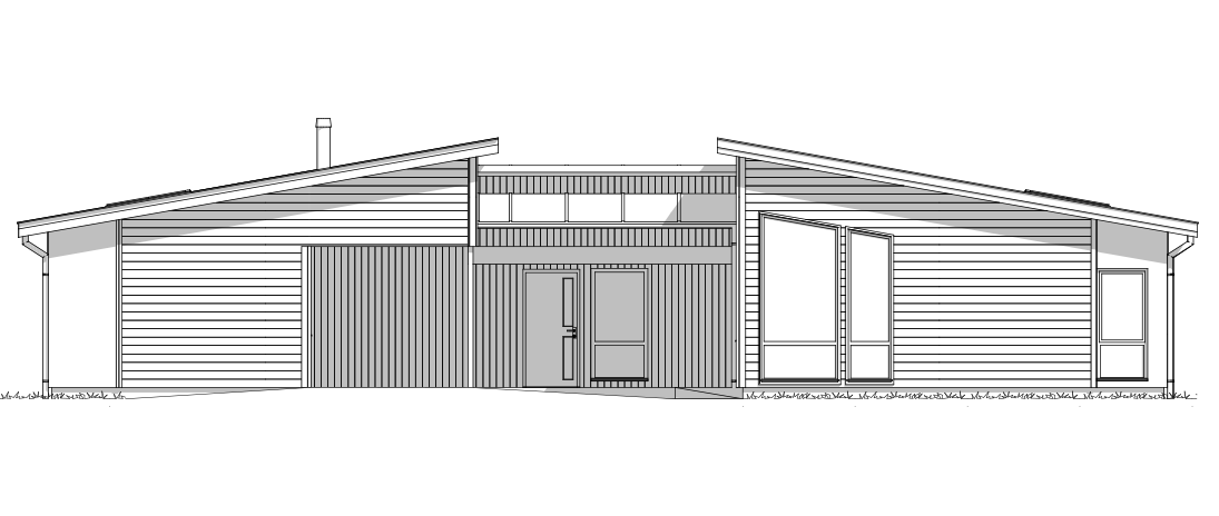 Omenås preges av to fløyer som knyttes sammen av et sentralt inngangsparti. Store vinduer og skrå himling gir mye naturlig lys i boligen.