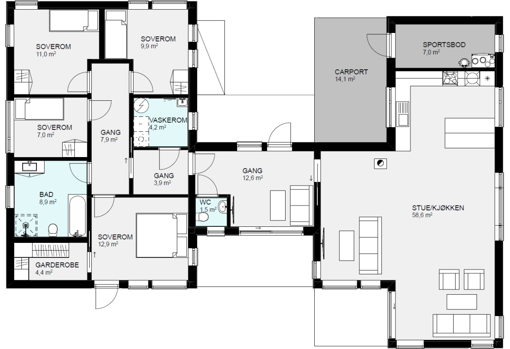 Boligen på 158m2 rommer hele fire soverom, bad, vaskerom og en stor åpen stue- og kjøkkenløsning. Fra boligens carport kan du ta deg inn i en sportsbod som gir gode muligheter for oppbevaring. Dette er boligen for deg som ønsker å ha alt samlet på en flate.